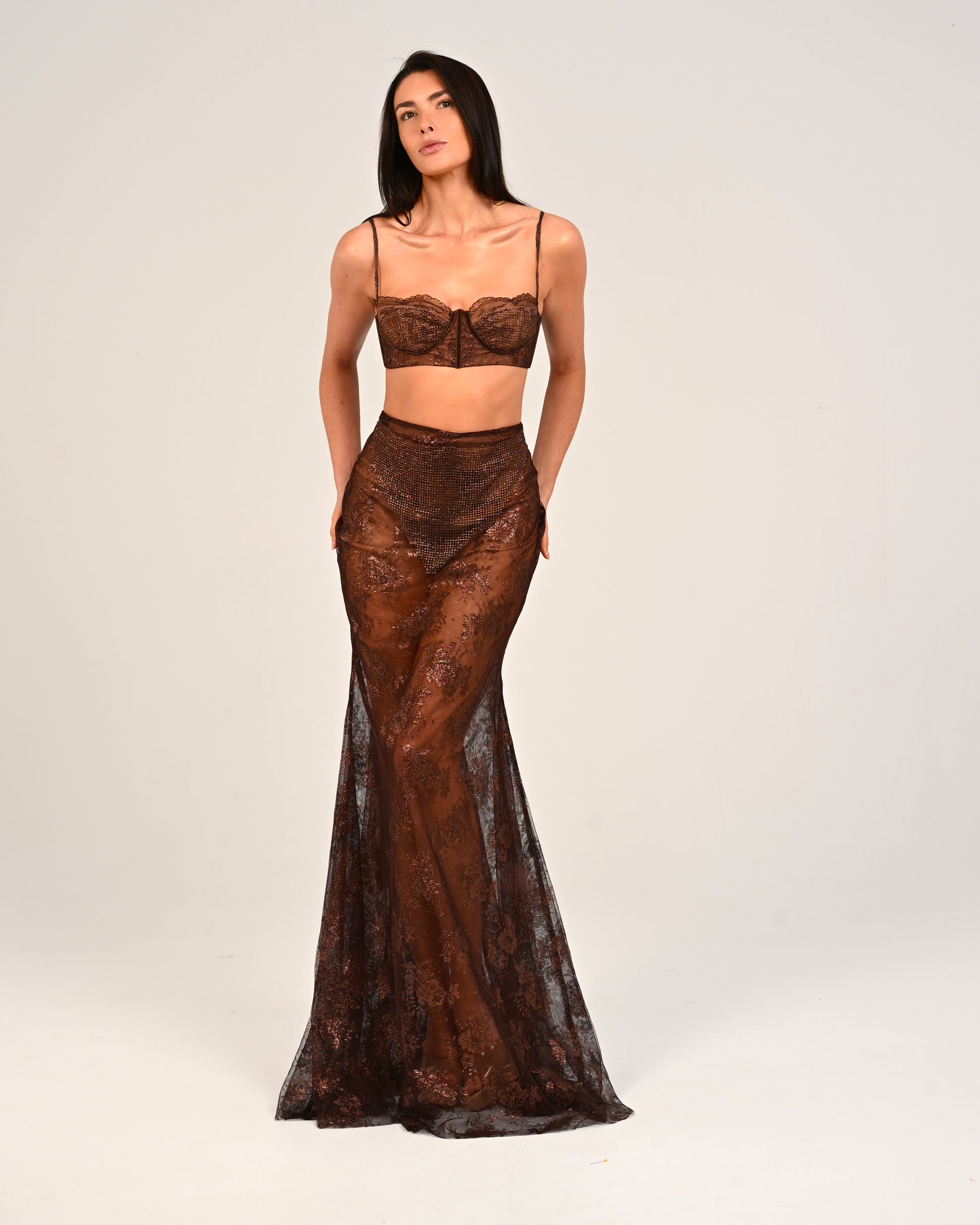 Designed in a bronze metallic lace with brown crystal detail embellishment and border details