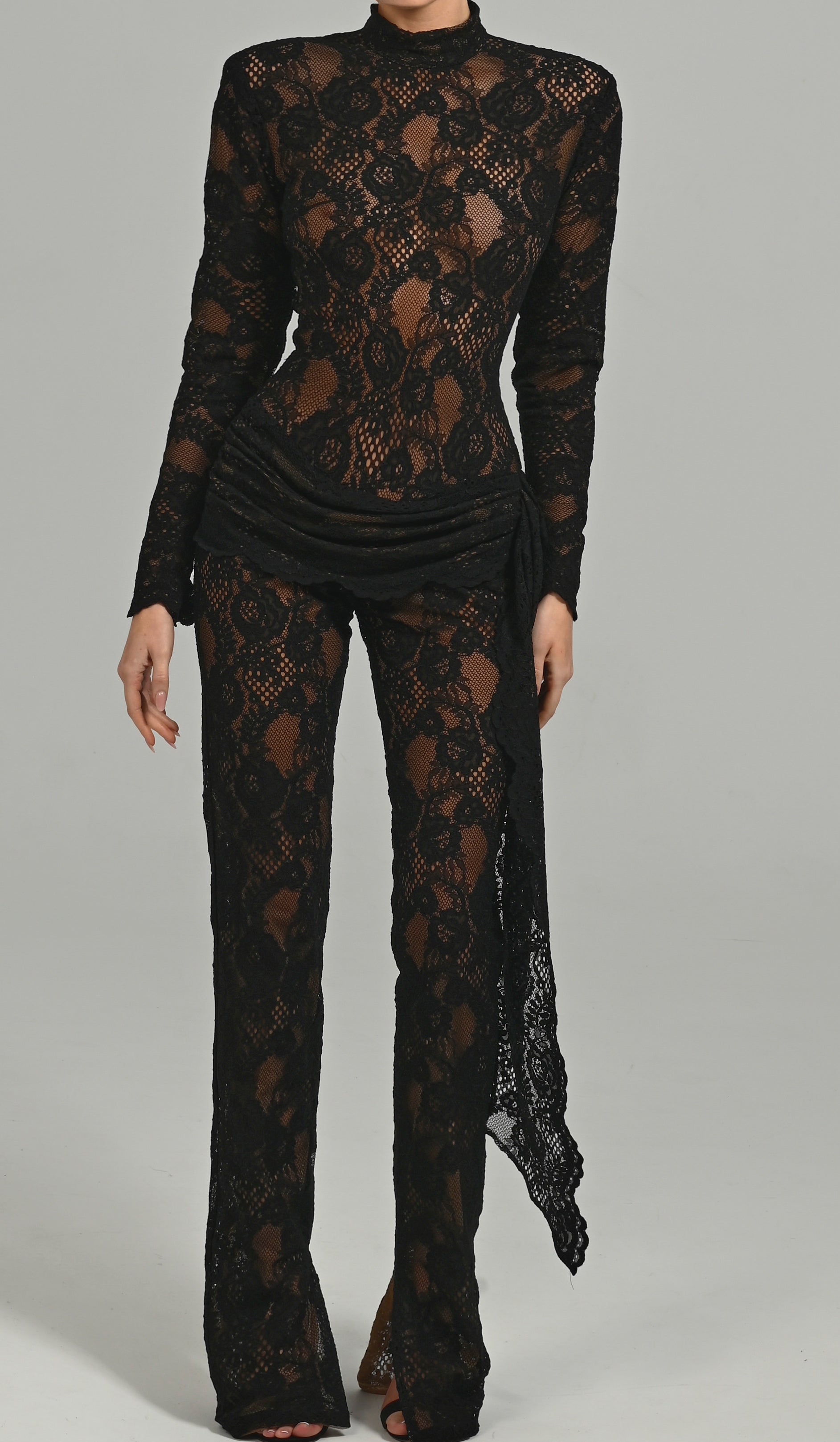 High Neck Lace Embroidered Jumpsuit with Straight Leg and Sash Detail