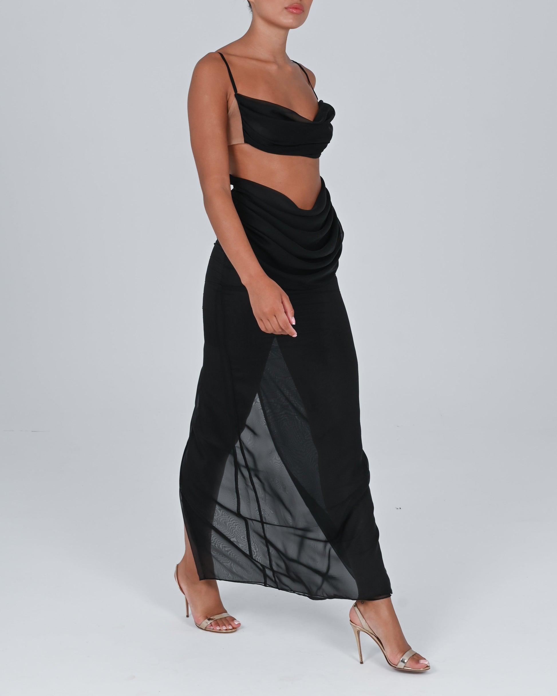 Black Draped Chiffon Crop Top with Net Detail and Cami Straps