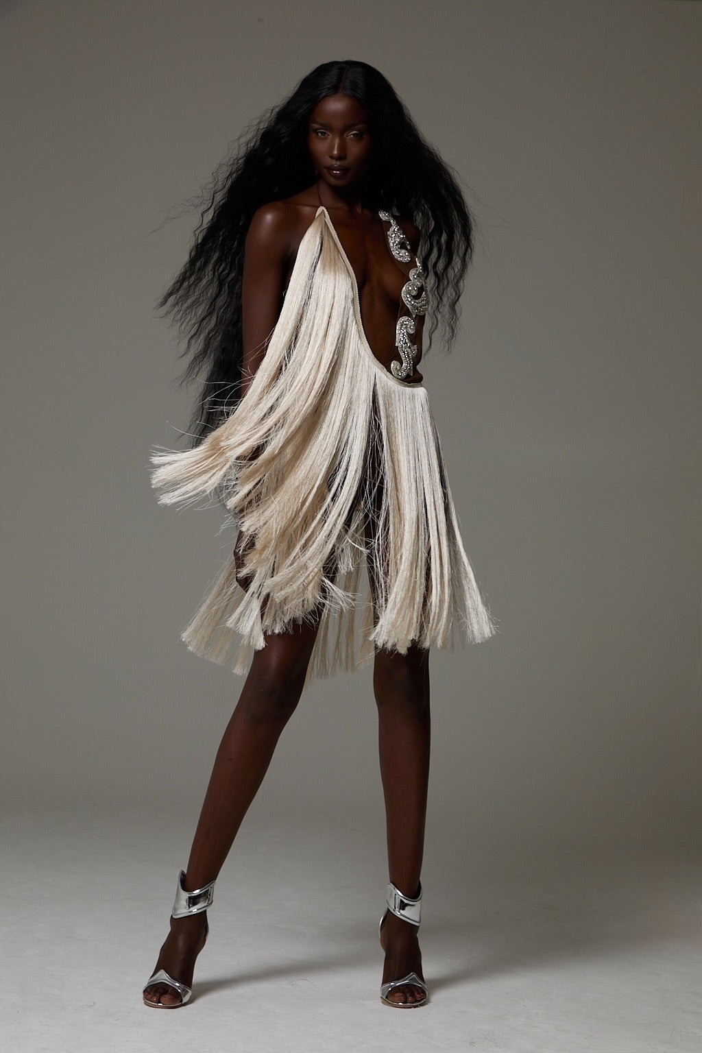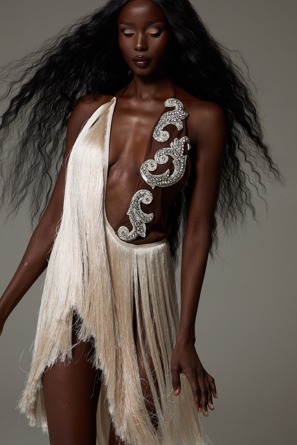 Plunge Neck Layered Fringe Mini Dress with Hand Sewn Silver Crystal Applique Details