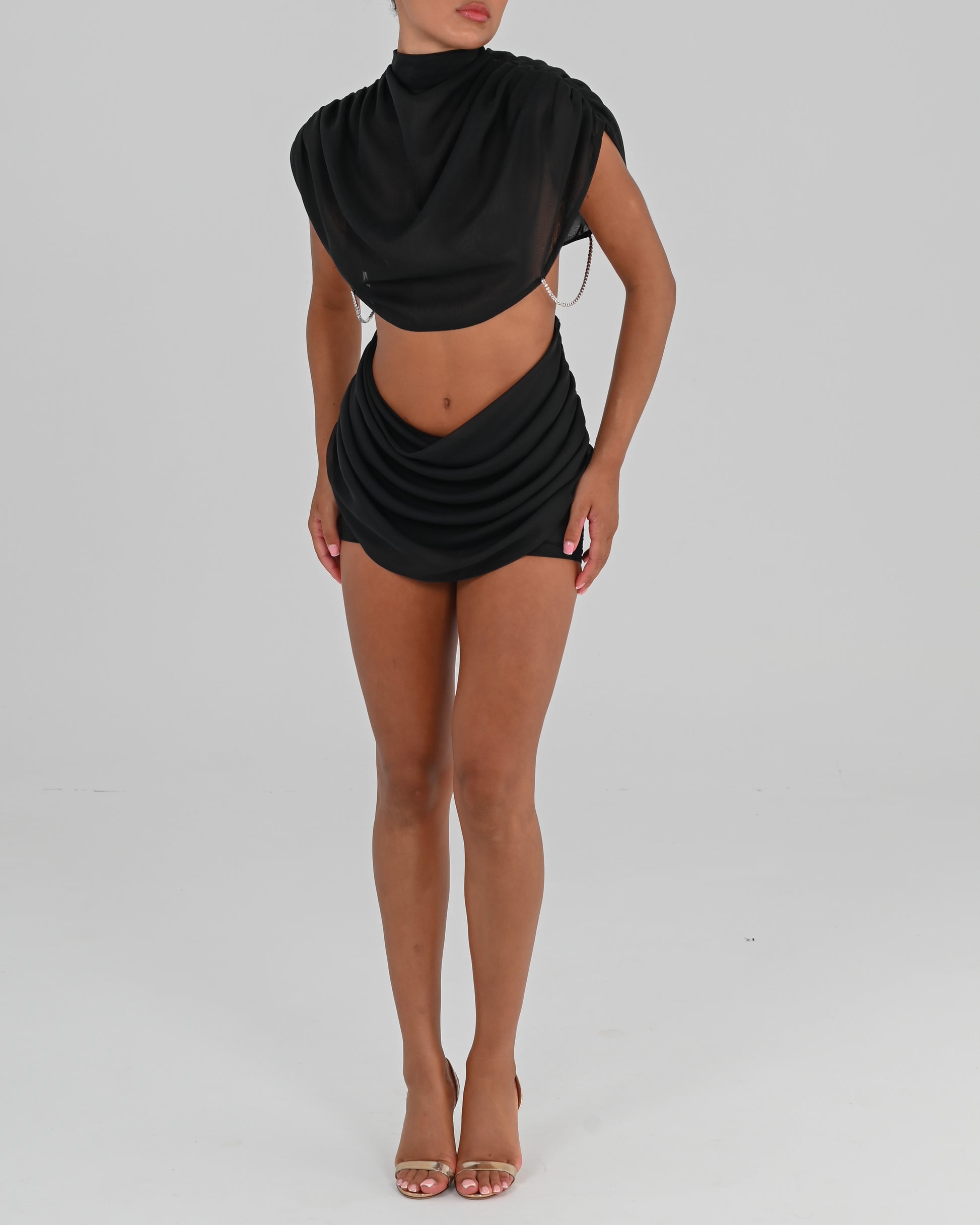Black Chiffon Draped High Neck Crop Top with Crystal Strap Detail