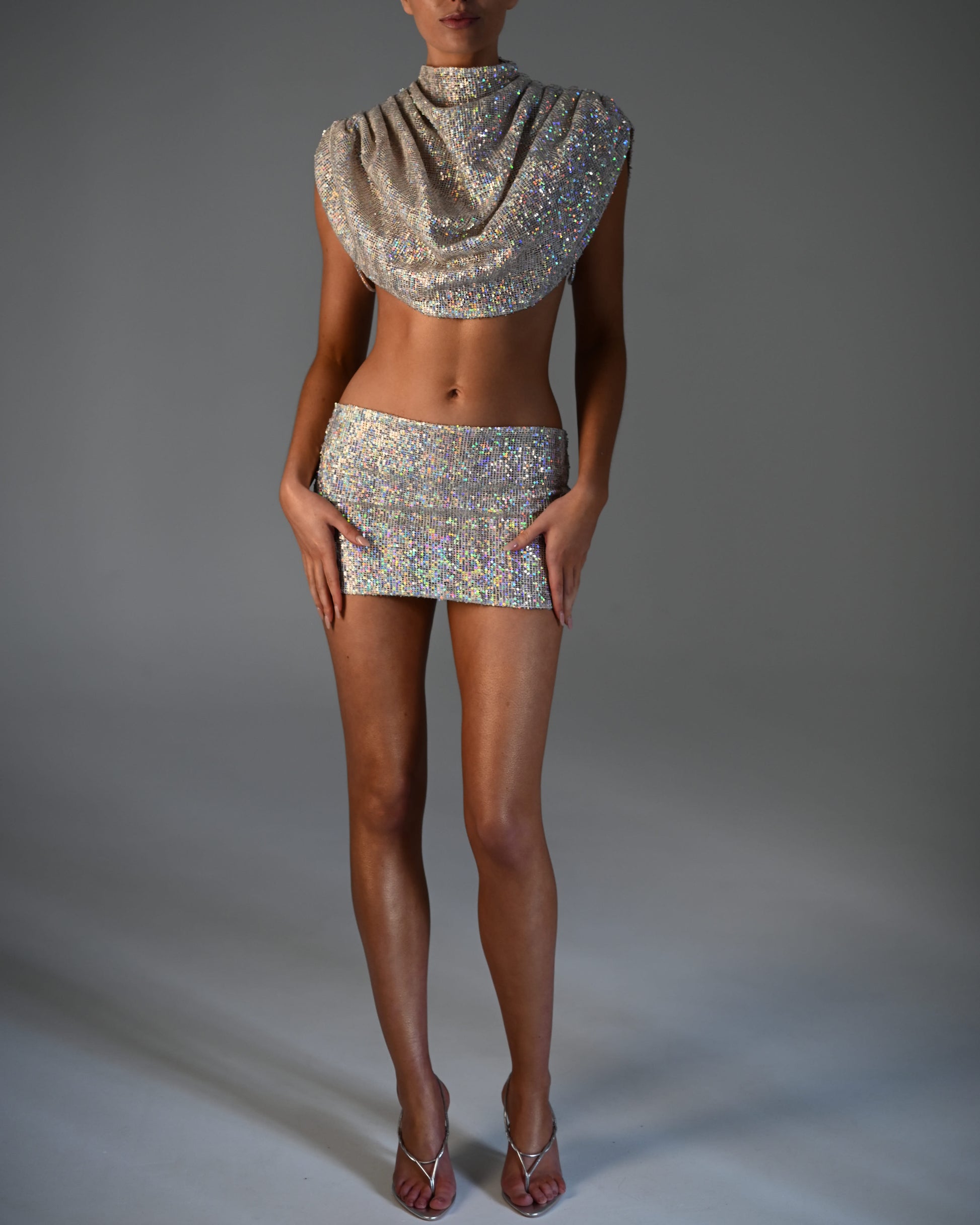 Silver Iridescent Sequin Draped High Neck Crop Top with Crystal Strap Detail