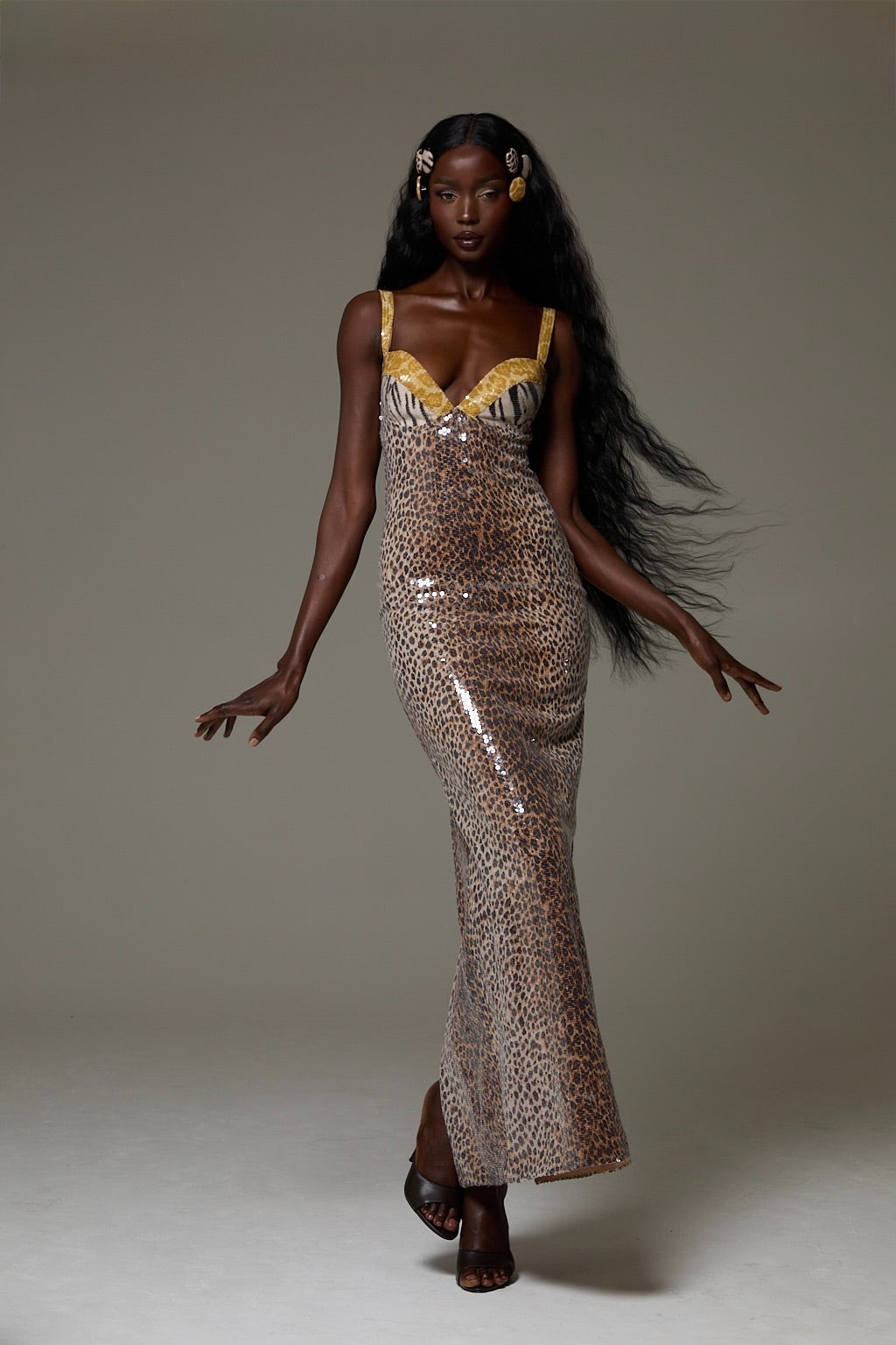 Mixed Animal Printed Sequin Maxi Dress with Back Split Detail