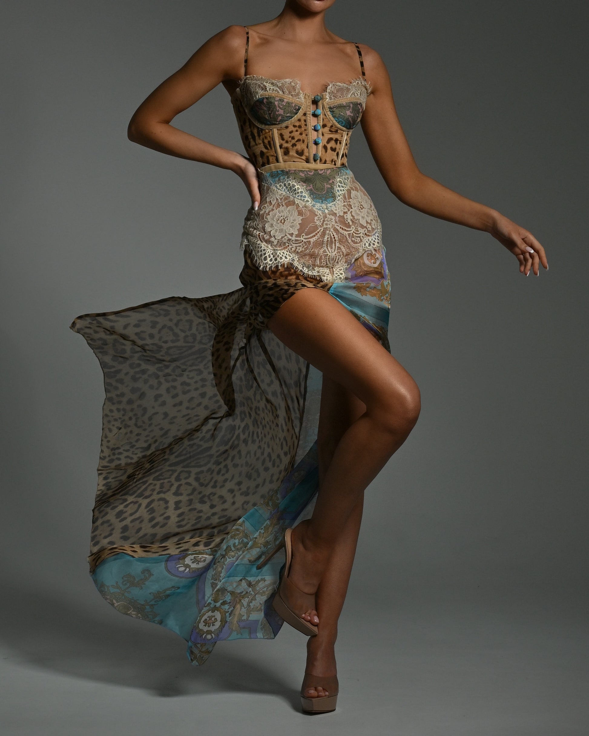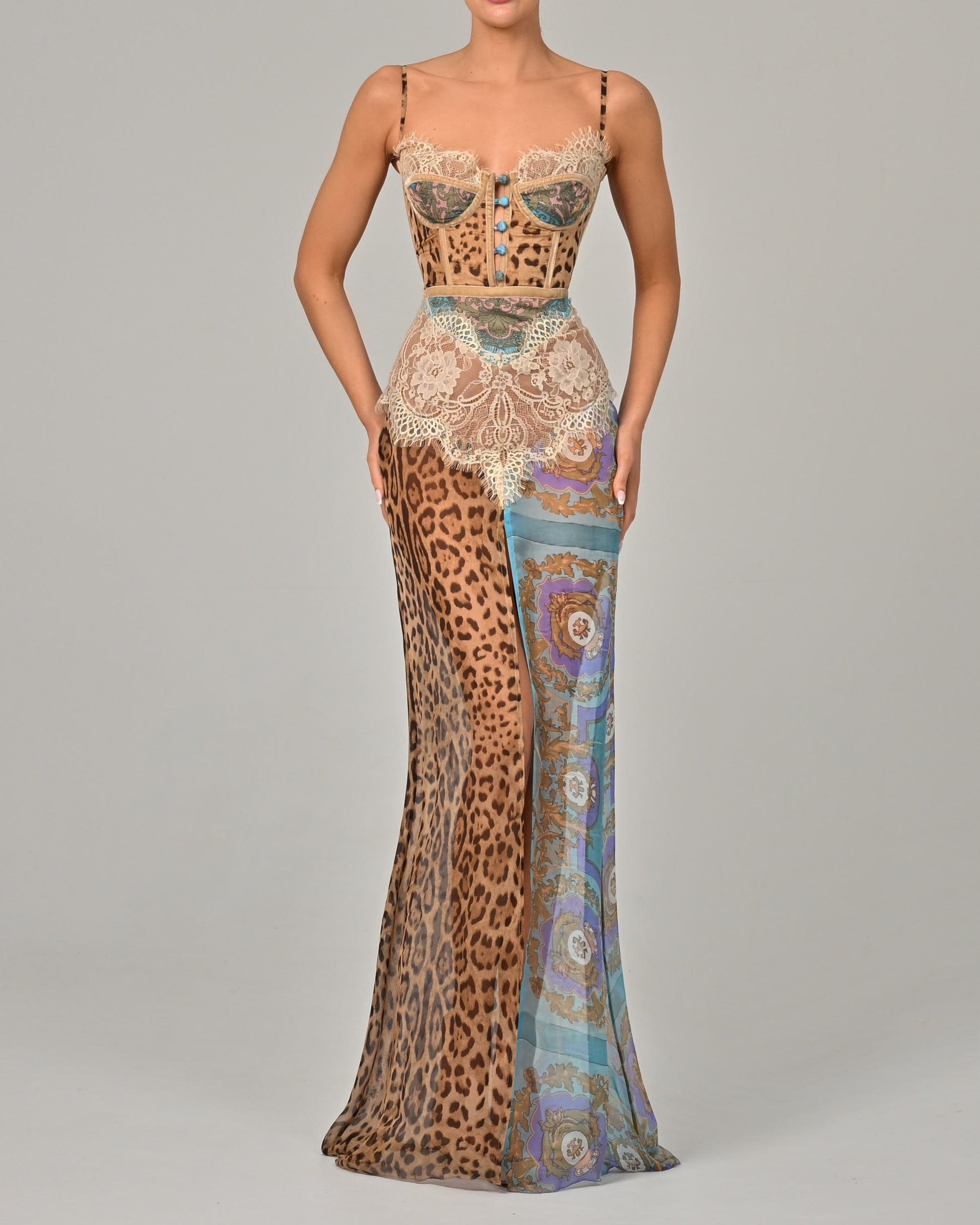 Silk Printed Maxi Dress, With Corset And Lace Details